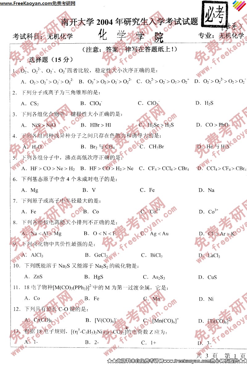 南开大学2004年半岛在线注册真题-无机化学