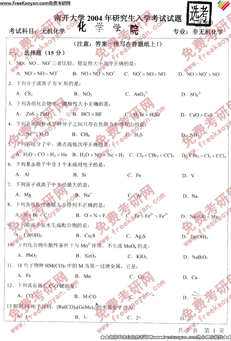 相关话题/无机化学 南开大学 半岛在线注册真题