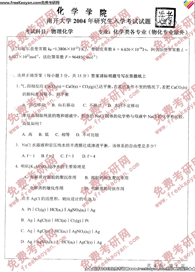 南开大学2004年半岛在线注册真题-物理化学