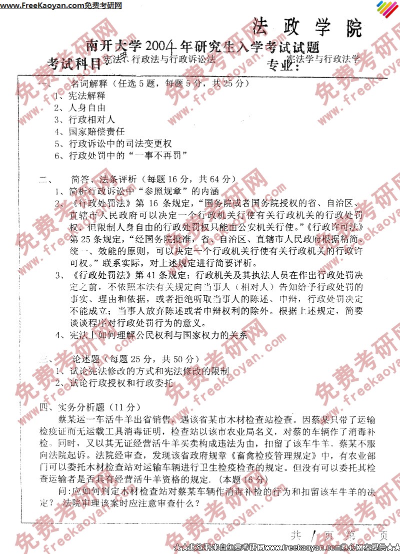 南开大学2004年半岛在线注册真题-宪法学、行政法与行政诉讼法