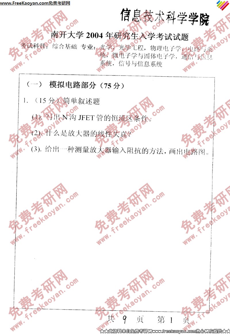 南开大学2004年半岛在线注册真题-信息科学技术学院综合基础
