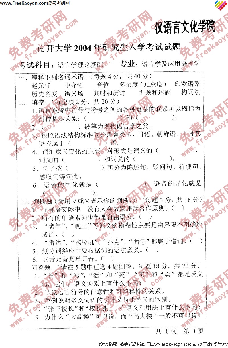 专业课半岛在线注册经验 本站小编 FreeKaoyan 2018-01-23南开大学2004年半岛在线注册真题-语言理论基础