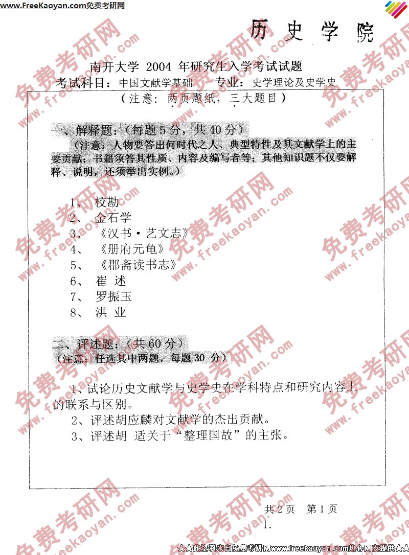 专业课半岛在线注册经验 本站小编 FreeKaoyan 2018-01-23南开大学2004年半岛在线注册真题-中国史学是与史学理论