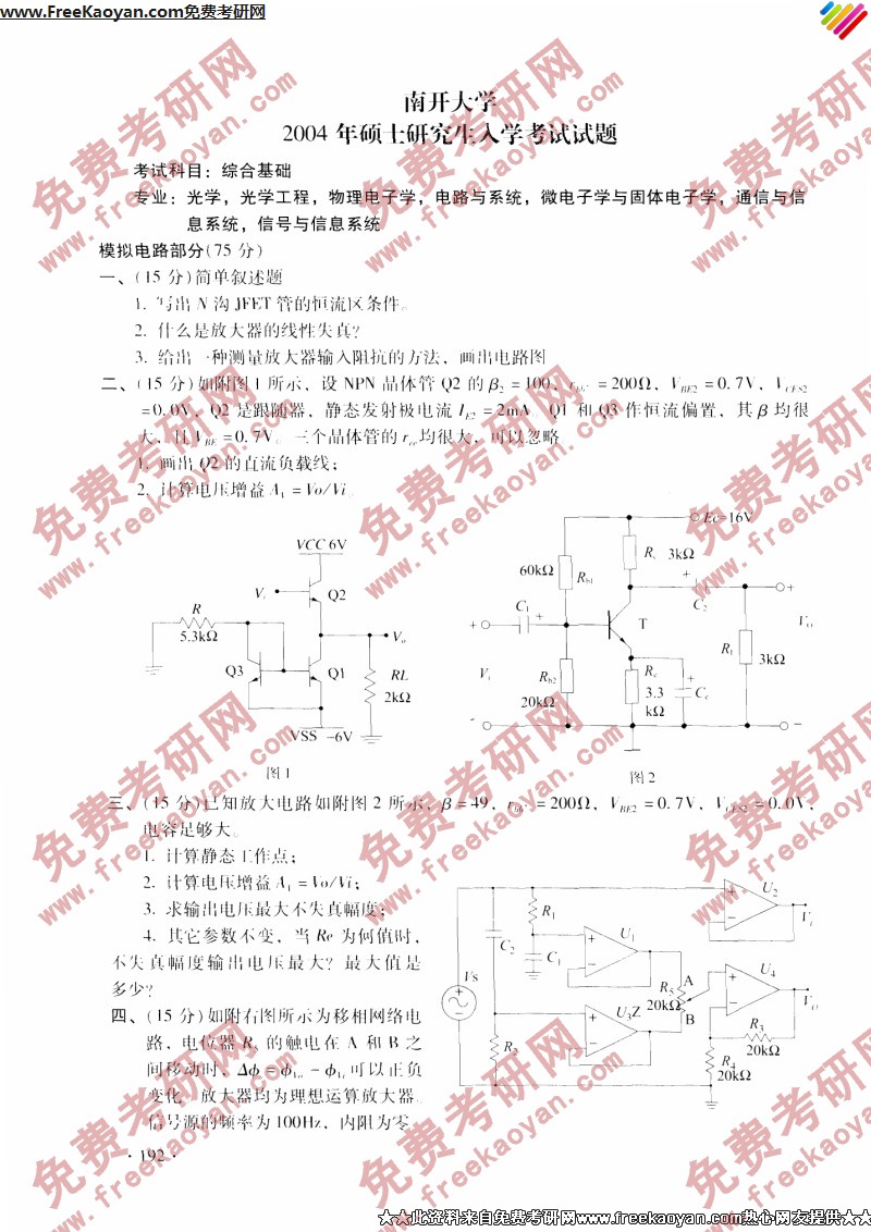 南开大学2004年半岛在线注册真题-综合基础(光学、光学工程等)