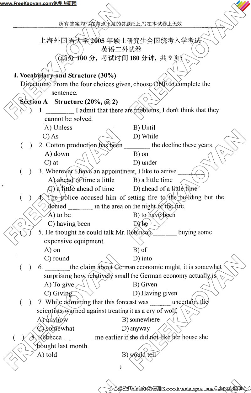 专业课半岛在线注册经验 本站小编 FreeKaoyan 2018-01-232001 年上海外国语大学英语综合试题答案I Cloze(1)Either (2)than (3) and (4)speak (5) parents (6)each (7)own (8)with (9)Otherwise(10)difference (11) by (12)With (13)masc ...