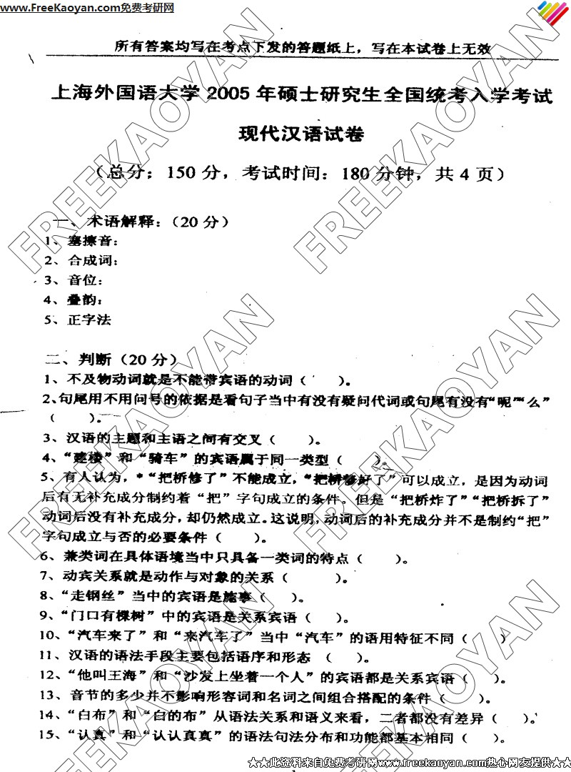 上海外国语大学2005年半岛在线注册真题-现代汉语