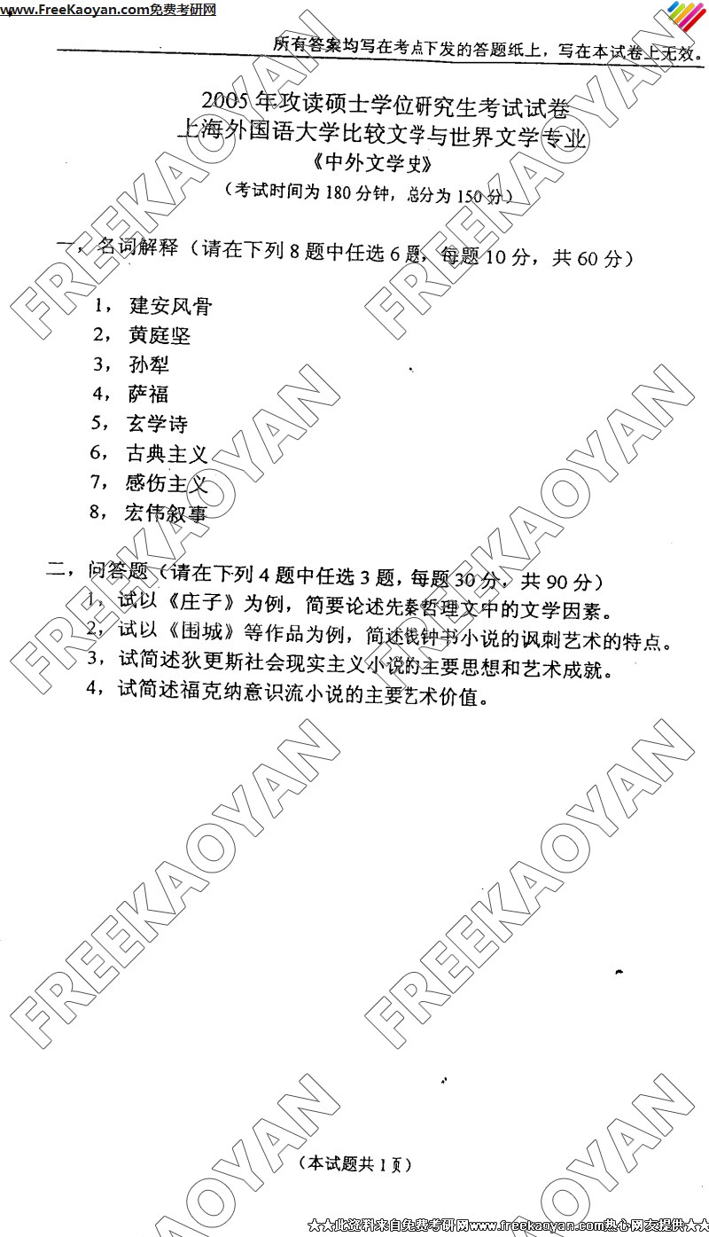 上海外国语大学2005年半岛在线注册真题-中外文学史