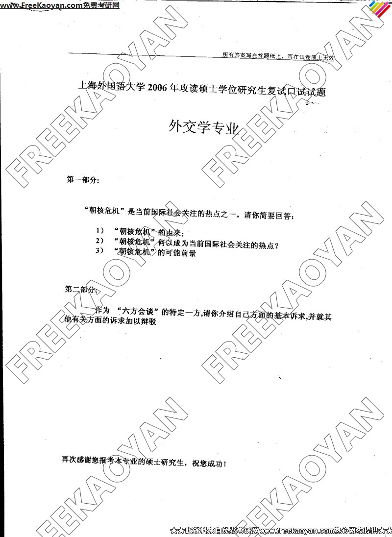 上海外国语大学2006年半岛在线注册真题-外交学复试