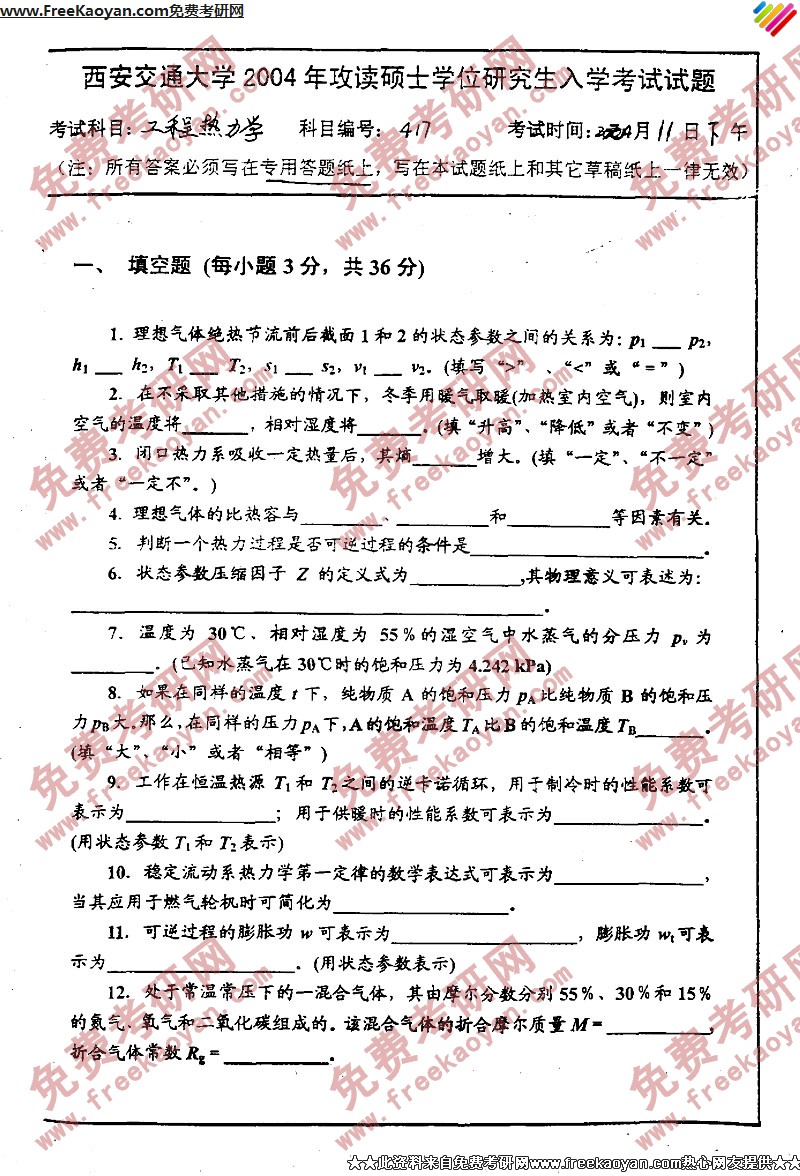 西安交通大学2004年半岛在线注册真题-工程热力学