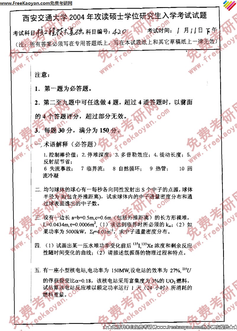 西安交通大学2004年半岛在线注册真题-核工程技术基础