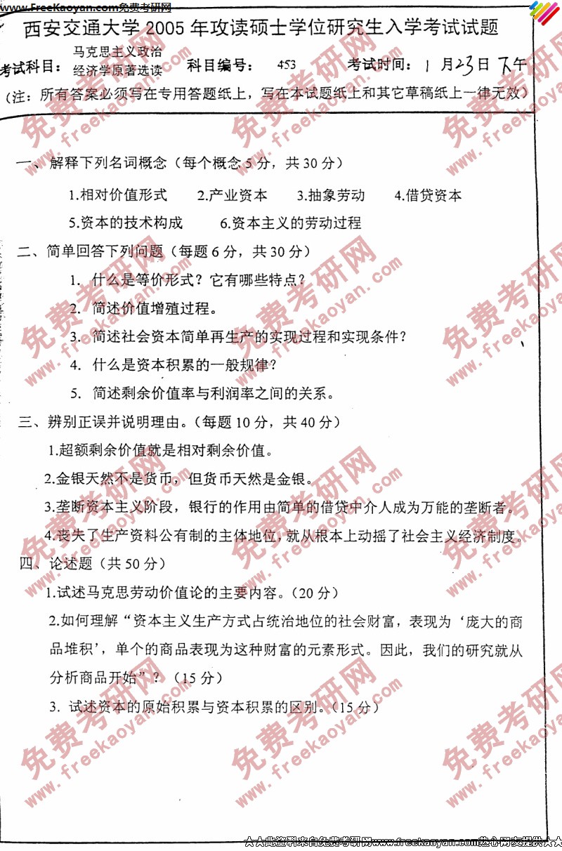 西安交通大学2005年半岛在线注册真题-马克思主义政治经济学原著选读