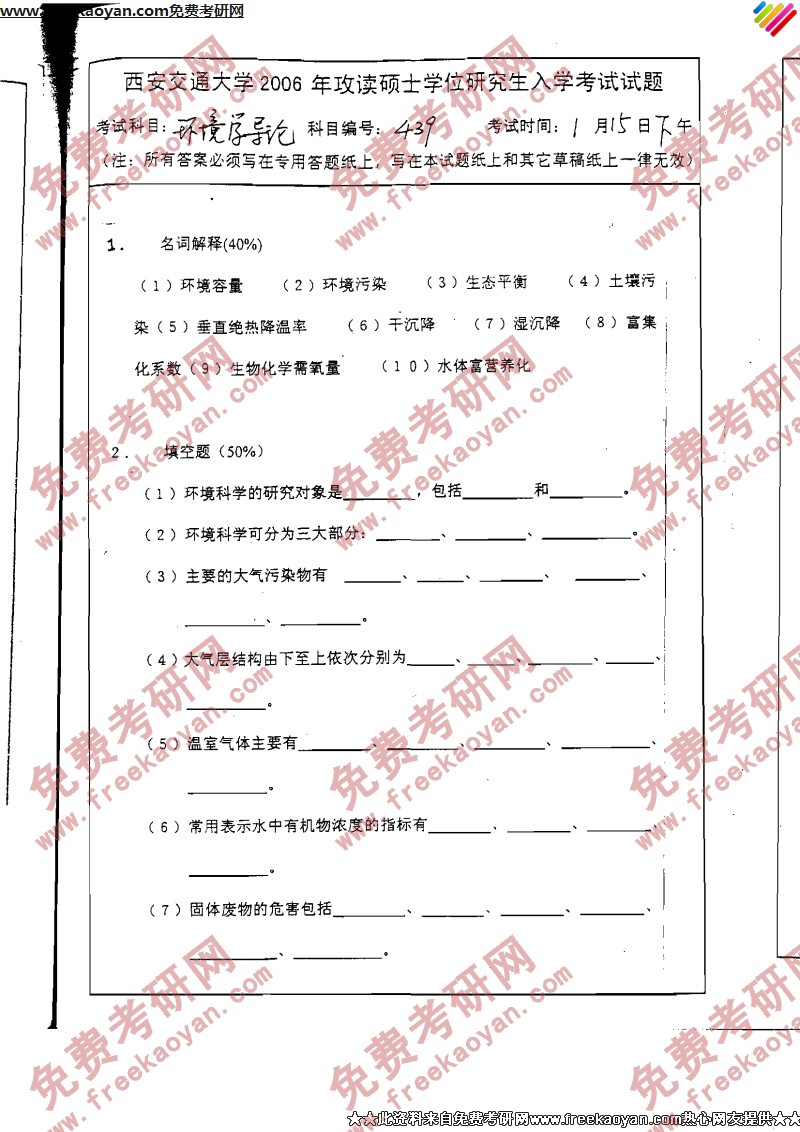 西安交通大学2006年半岛在线注册真题-环境学导论