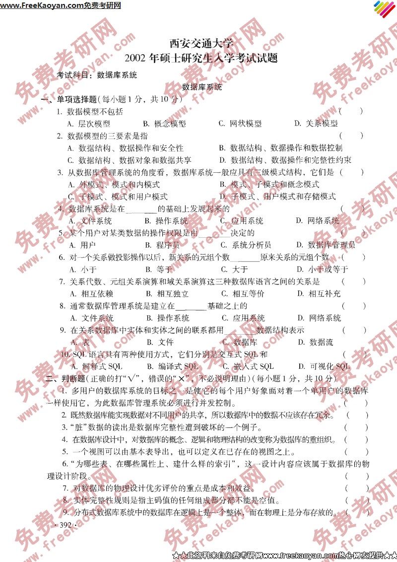 西安交通大学2002年半岛在线注册真题-数据库系统