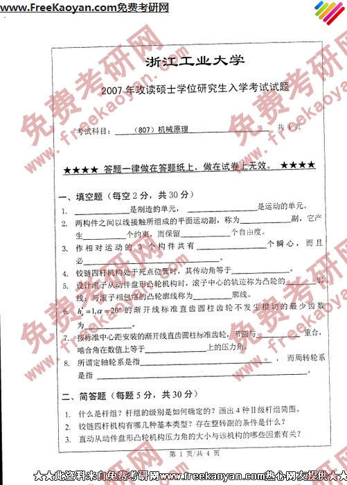 浙江工业大学2007年半岛在线注册真题-机械原理
