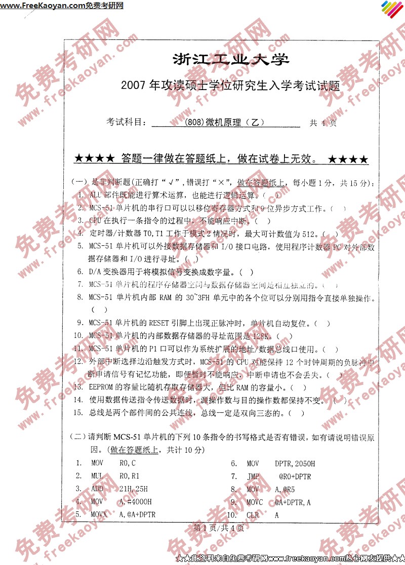 浙江工业大学2007年半岛在线注册真题-微机原理