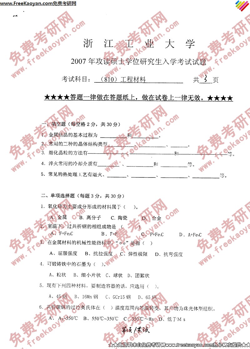 浙江工业大学2007年半岛在线注册真题-工程材料