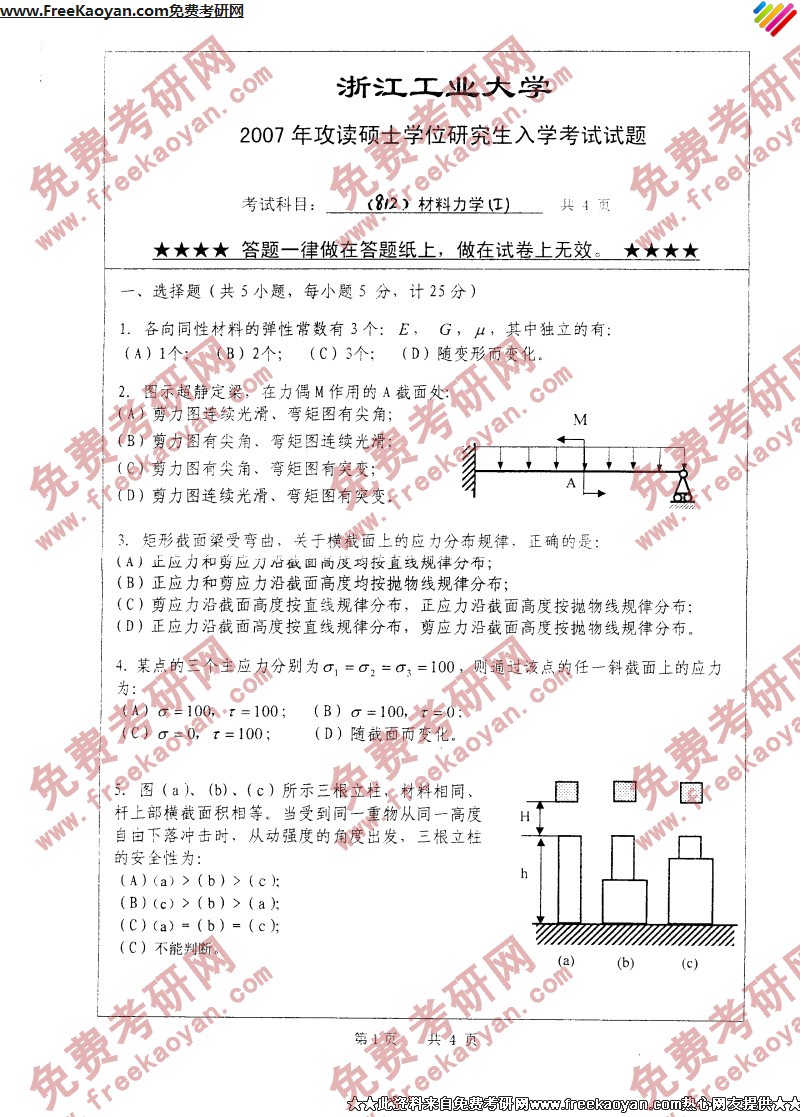 浙江工业大学2007年半岛在线注册真题-材料力学I