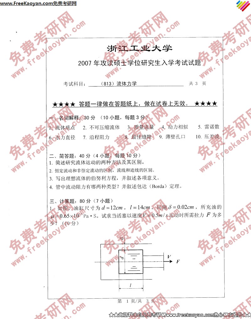 浙江工业大学2007年半岛在线注册真题-流体力学
