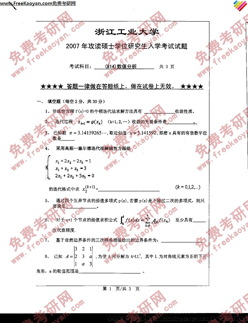 浙江工业大学2007年半岛在线注册真题-数值分析
