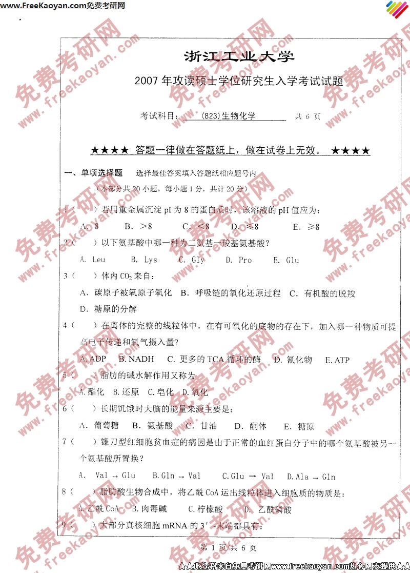 浙江工业大学2007年半岛在线注册真题-生物化学