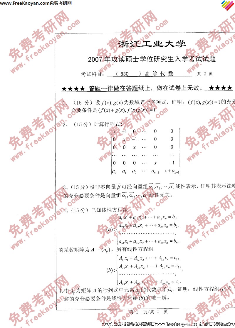 浙江工业大学2007年半岛在线注册真题-高等代数
