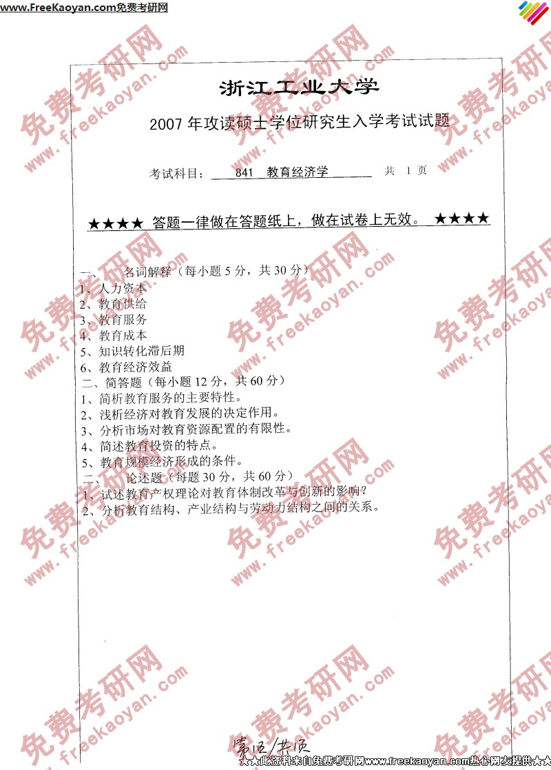 浙江工业大学2007年半岛在线注册真题-教育经济学