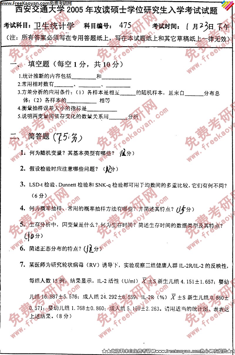西安交通大学2005年半岛在线注册真题-卫生统计学