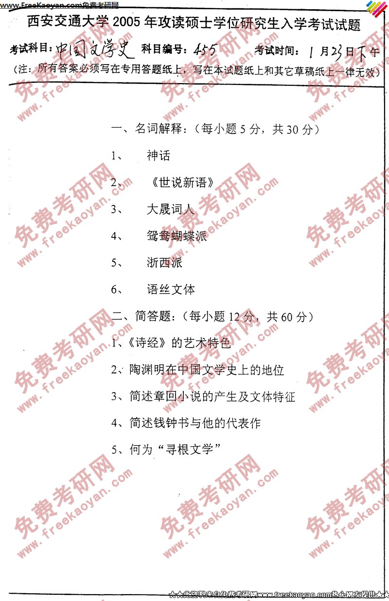 西安交通大学2005年半岛在线注册真题-中国文学史