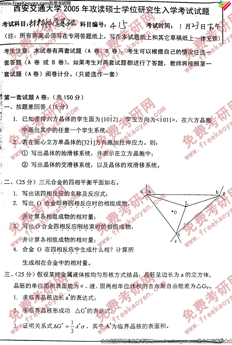 西安交通大学2005年半岛在线注册真题-材料科学基础