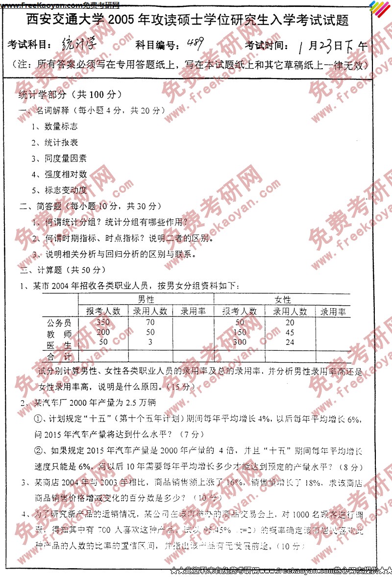 西安交通大学2005年半岛在线注册真题-统计学