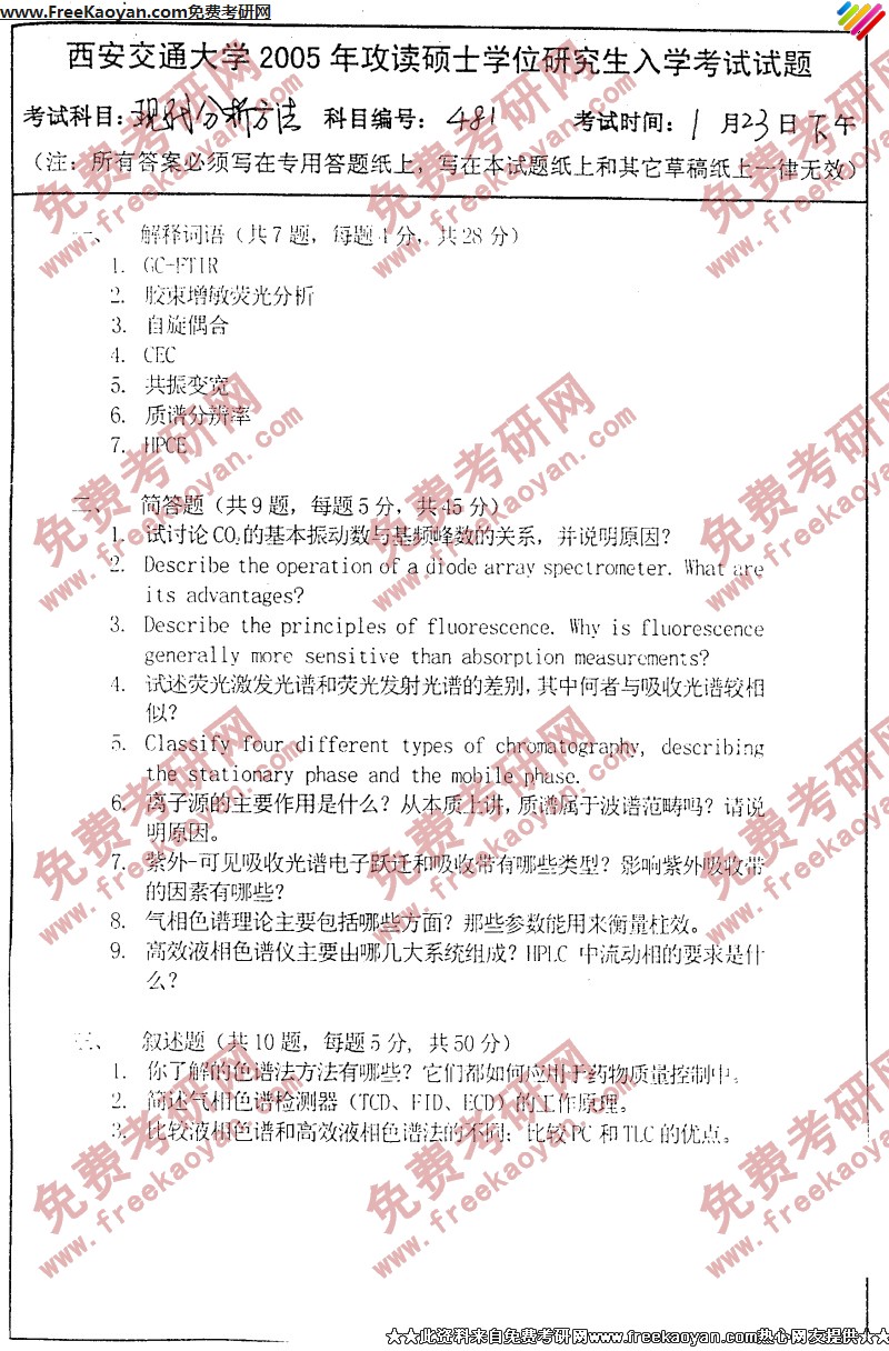西安交通大学2005年半岛在线注册真题-现代分析方法