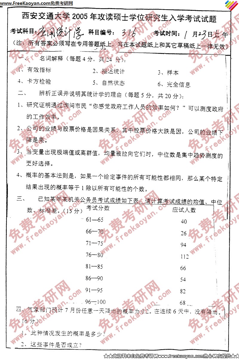 专业课半岛在线注册经验 本站小编 FreeKaoyan 2018-01-23西安交通大学2005年半岛在线注册真题-统计学