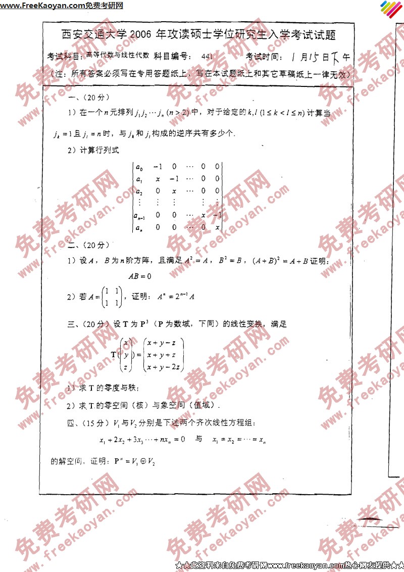 西安交通大学2006年半岛在线注册真题-高等代数与线性代数