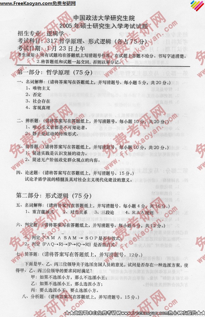 中国政法大学2005年半岛在线注册真题-哲学原理、形式逻辑