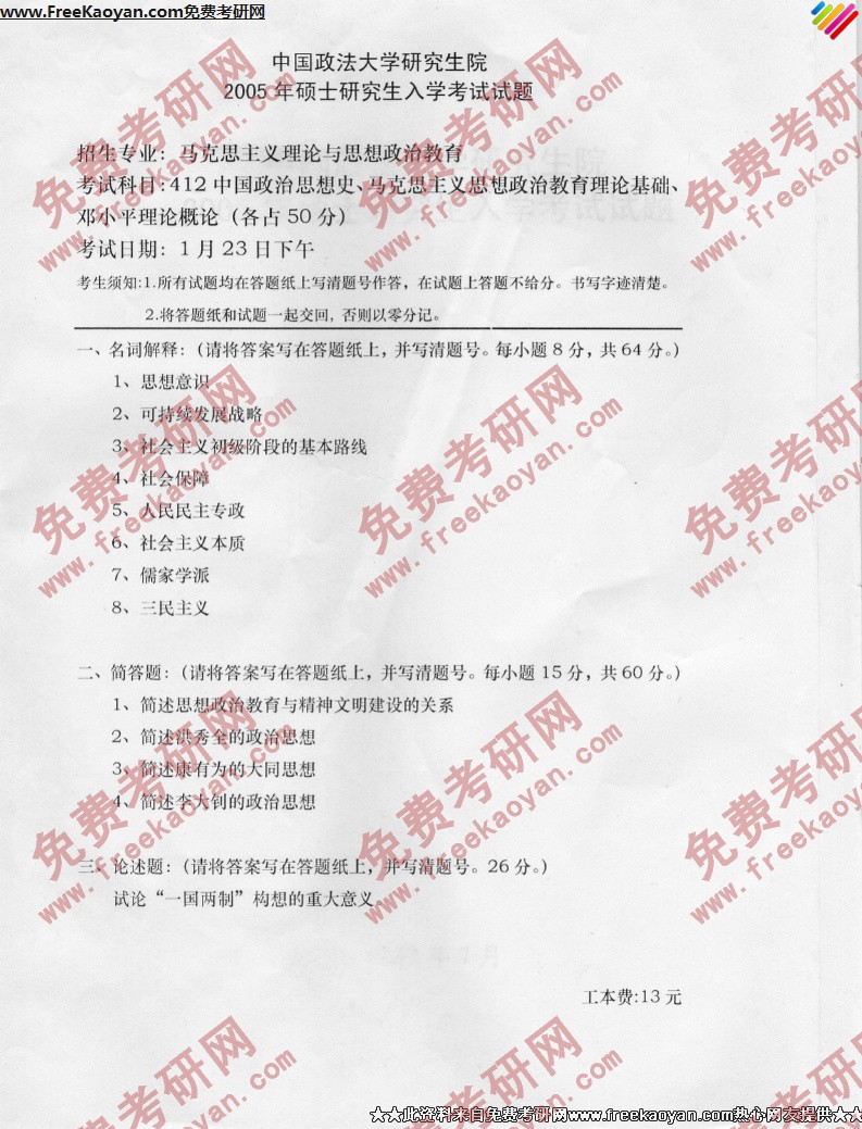 中国政法大学2005年半岛在线注册真题-中国政治思想史、马克思主义思想政治教育理论基础