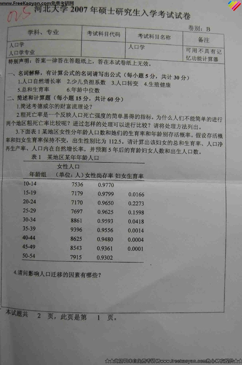 河北大学2007年半岛在线注册真题-人口学