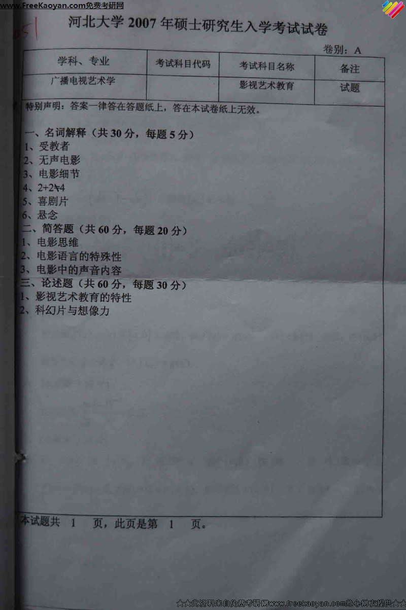 河北大学2007年半岛在线注册真题-影视艺术教育