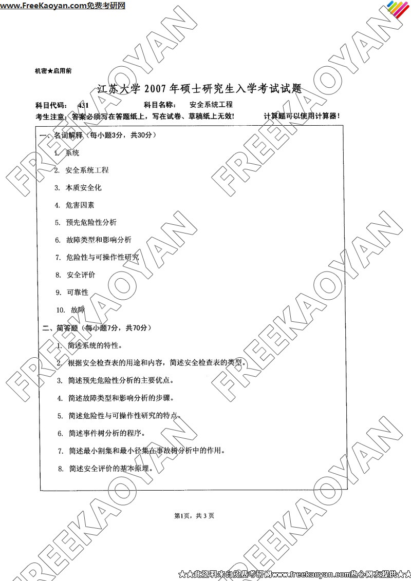 江苏大学2007年半岛在线注册真题-安全系统工程