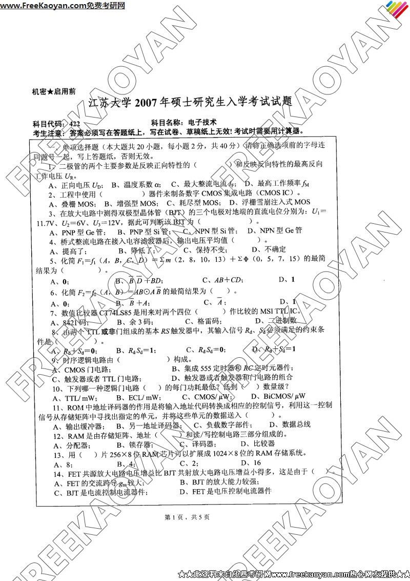江苏大学2007年半岛在线注册真题-电子技术