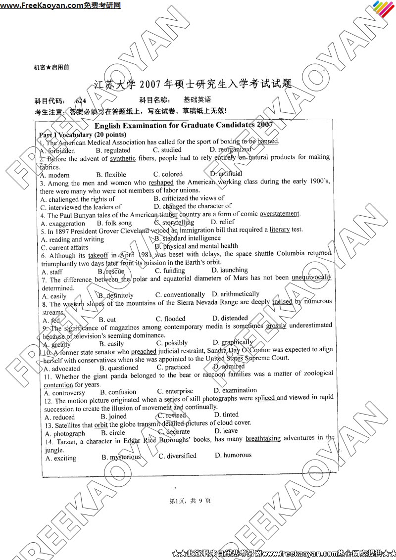 江苏大学2007年半岛在线注册真题-基础英语