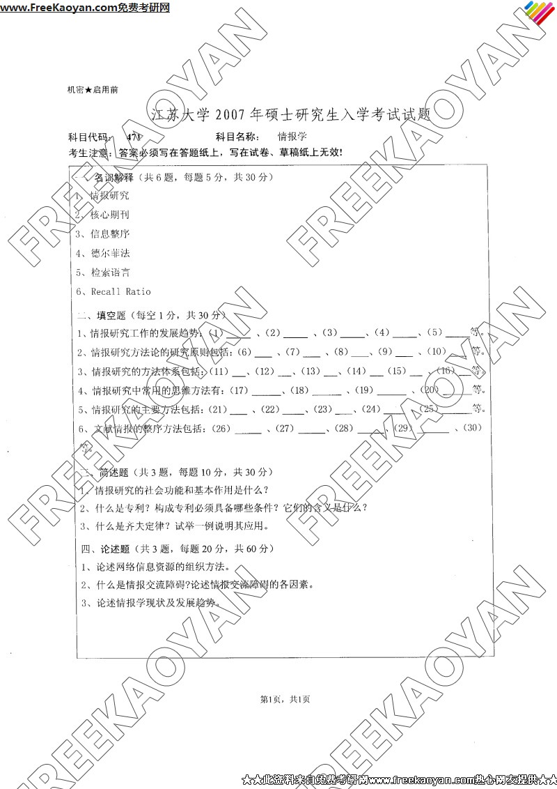 江苏大学2007年半岛在线注册真题-情报学