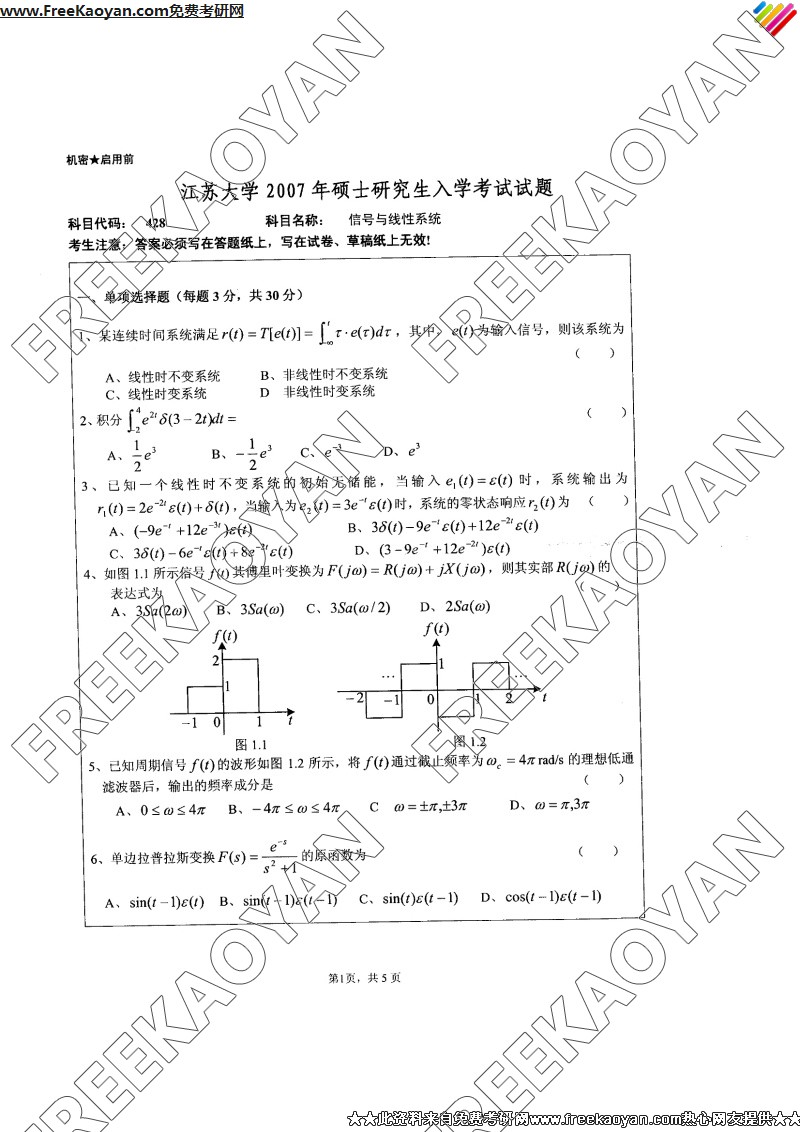 专业课半岛在线注册经验 本站小编 FreeKaoyan 2018-01-23江苏大学2007年半岛在线注册真题-信号与系统