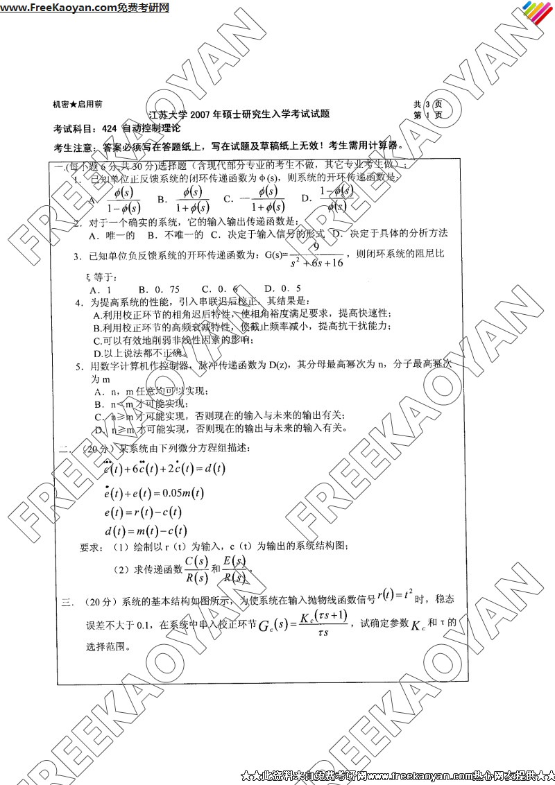 江苏大学2007年半岛在线注册真题-自动控制理论
