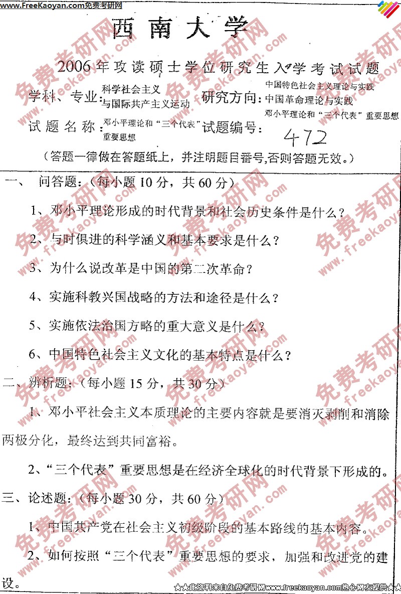 西南大学2006年半岛在线注册真题-邓小平理论和三个代表重要思想