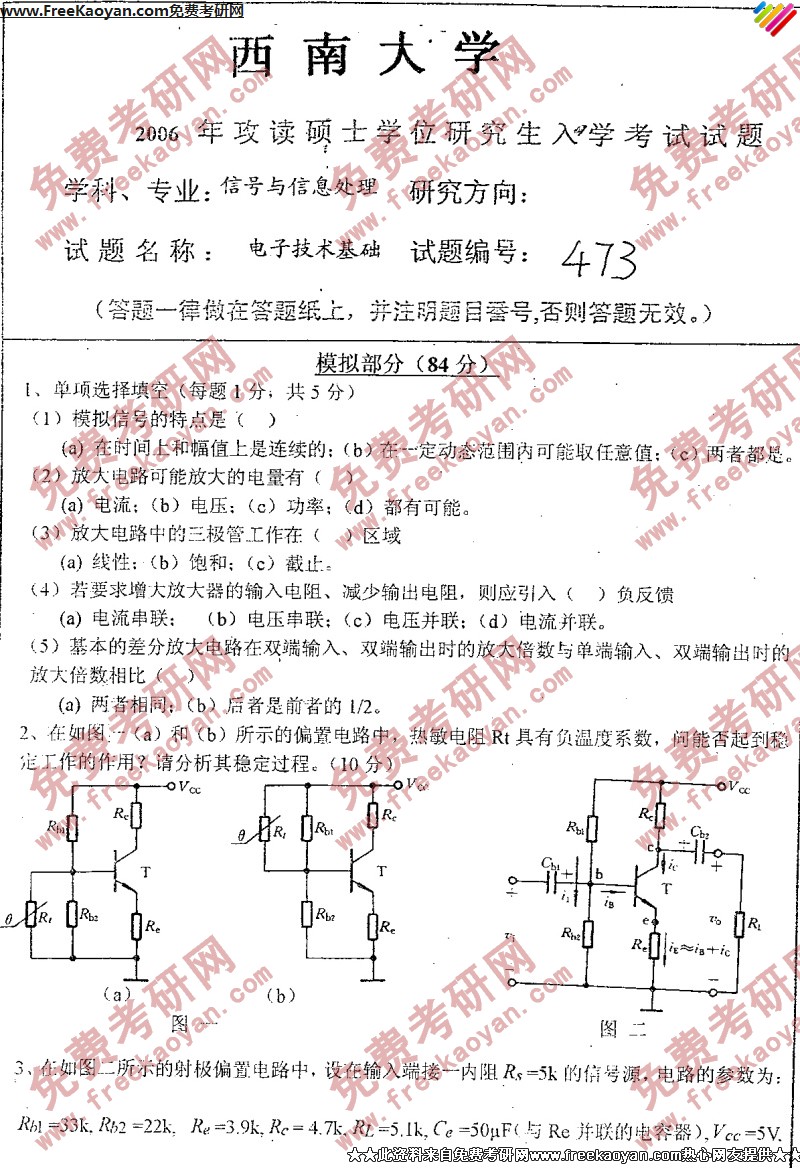 西南大学2006年半岛在线注册真题-电子技术基础