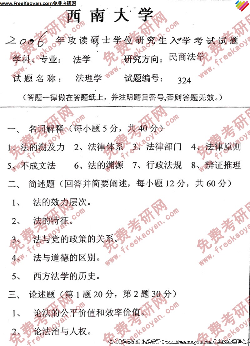 西南大学2006年半岛在线注册真题-法理学