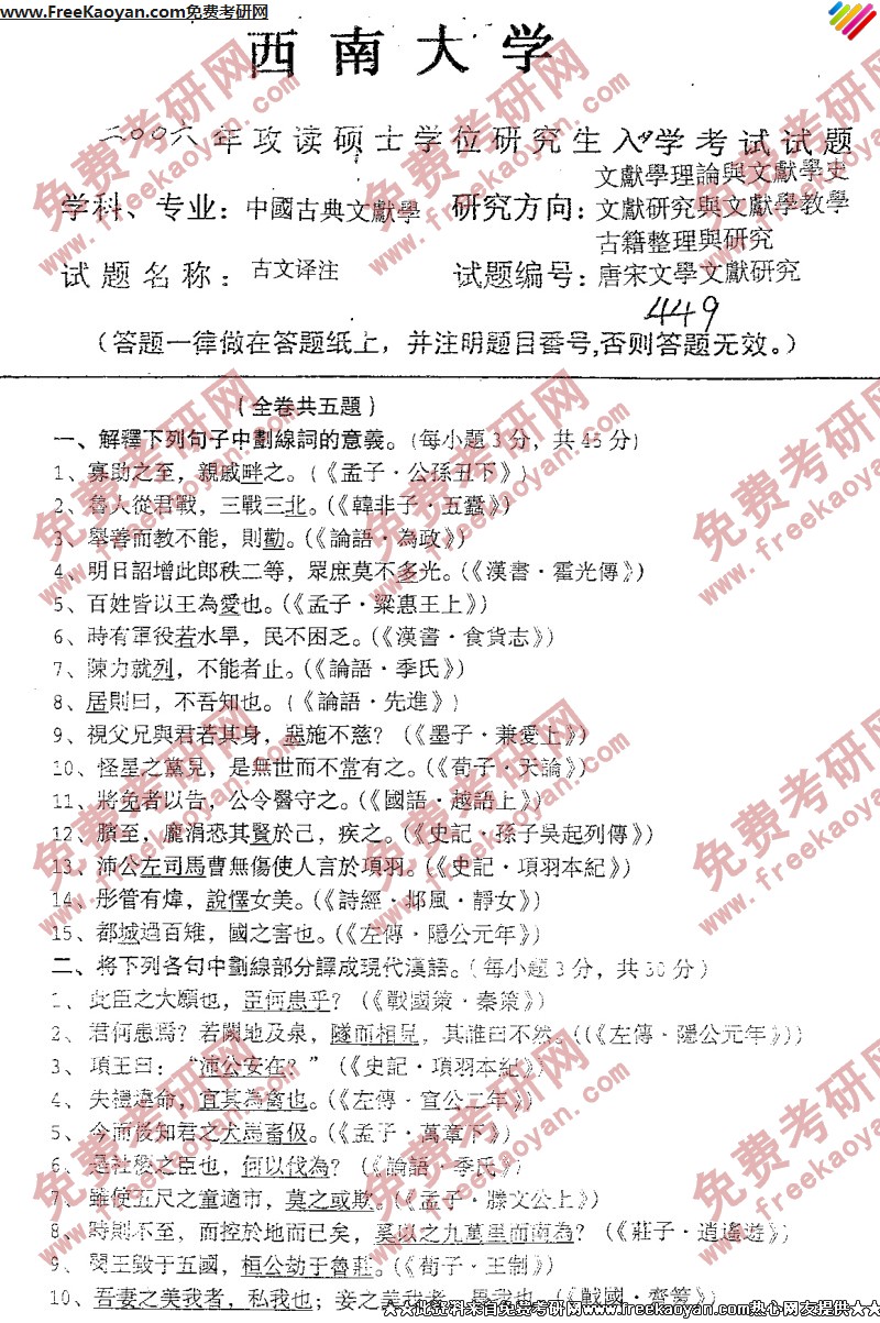 专业课半岛在线注册经验 本站小编 FreeKaoyan 2018-01-23西南大学2006年半岛在线注册真题-古代汉语(含文化常识)