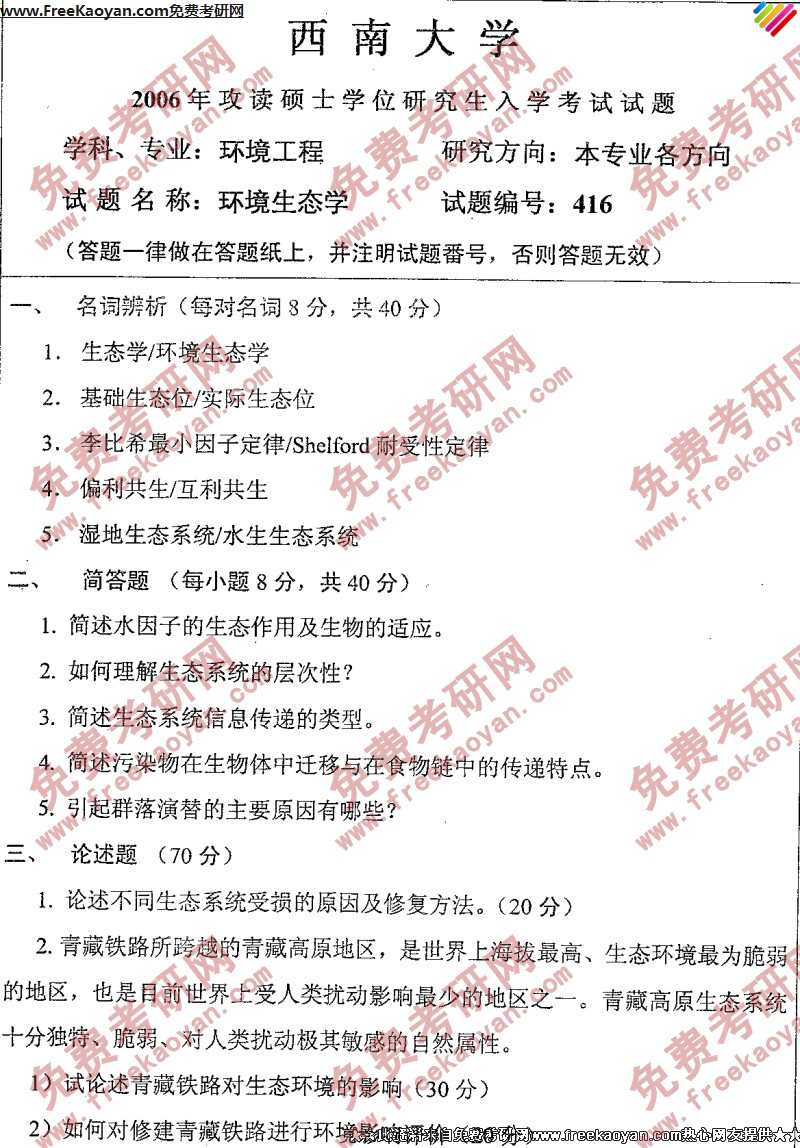 专业课半岛在线注册经验 本站小编 FreeKaoyan 2018-01-23西南大学2006年半岛在线注册真题-环境科学467