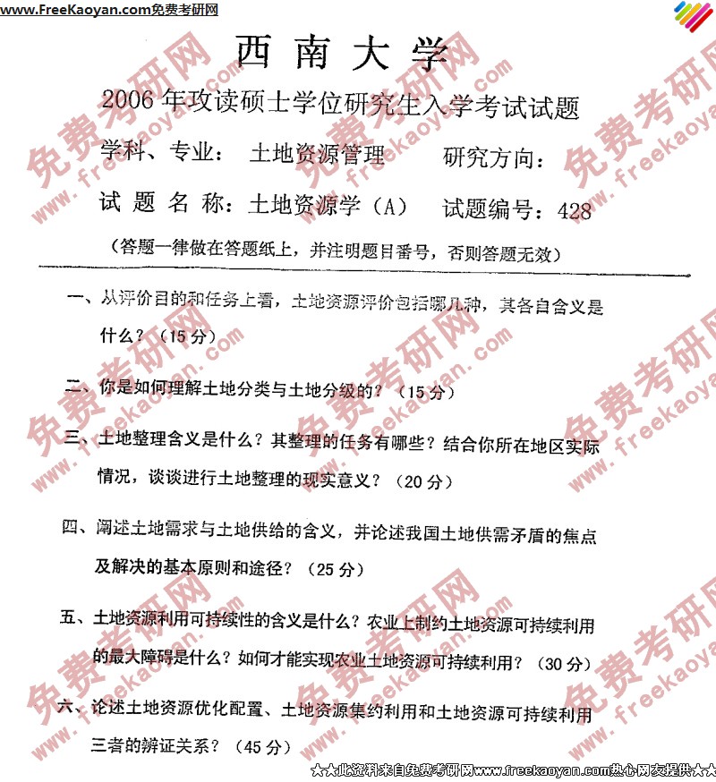 专业课半岛在线注册经验 本站小编 FreeKaoyan 2018-01-23西南大学2006年半岛在线注册真题-土地管理学