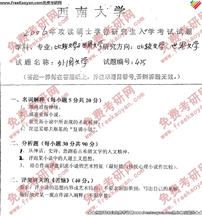 西南大学2006年半岛在线注册真题-外国文学